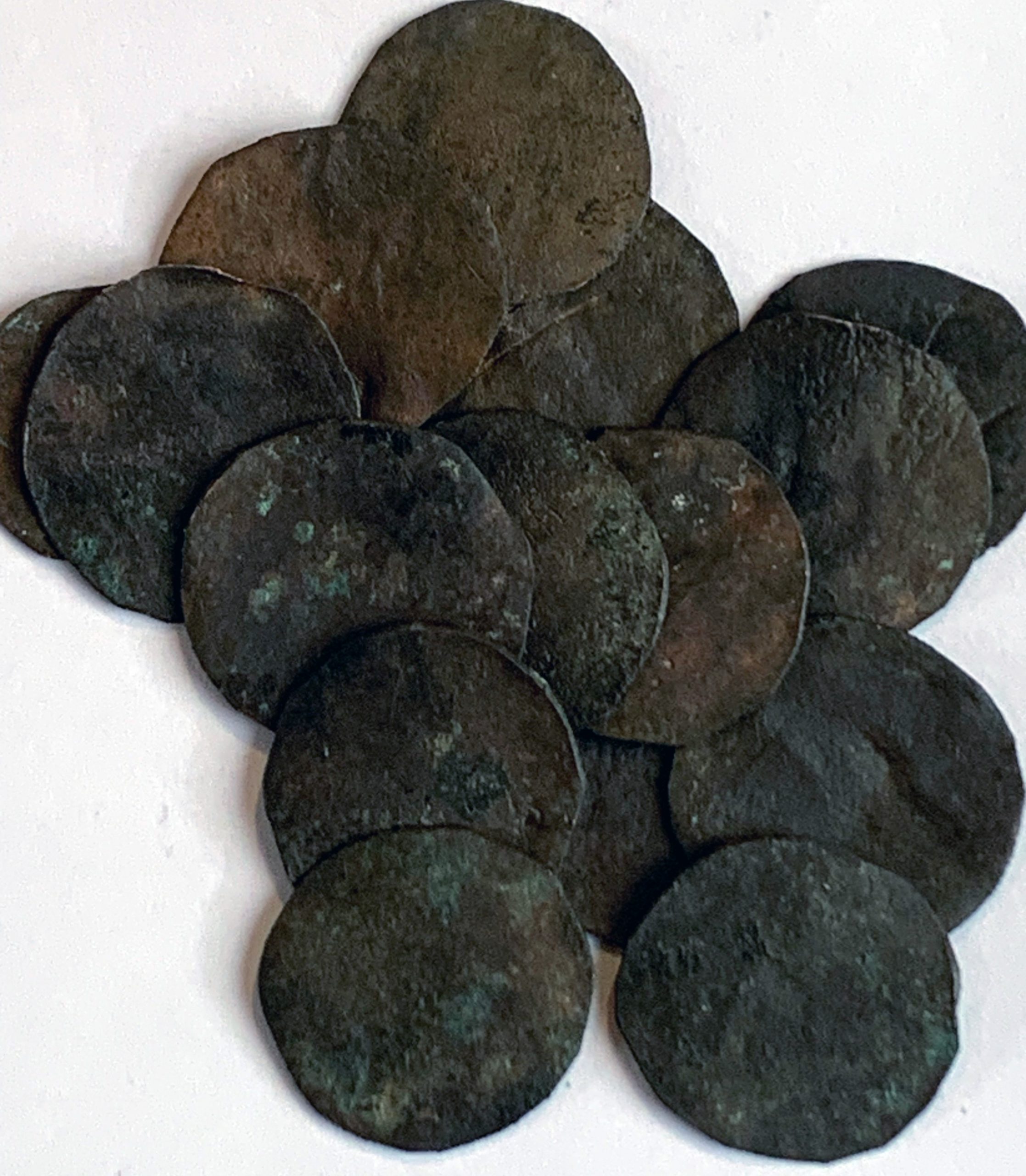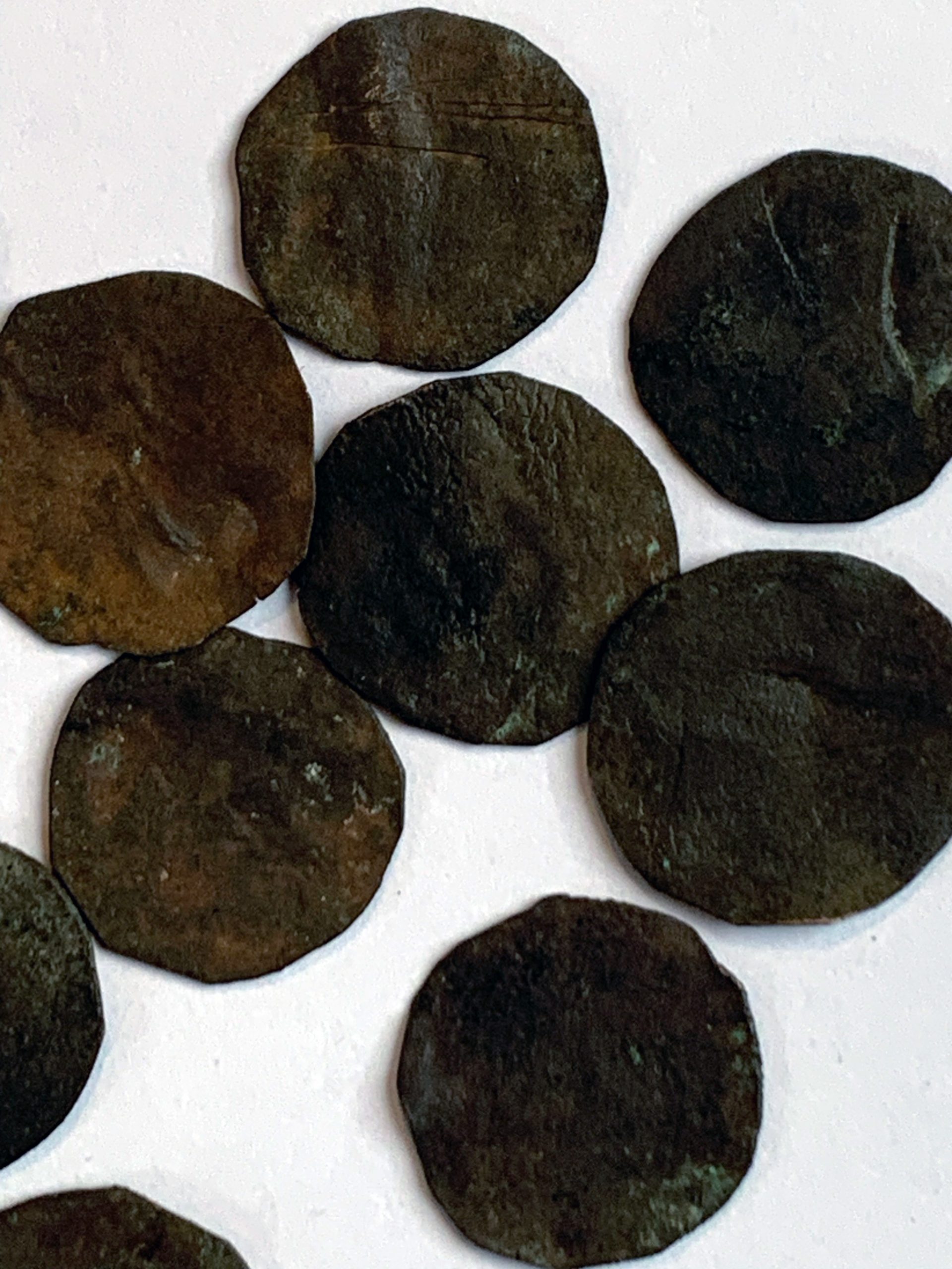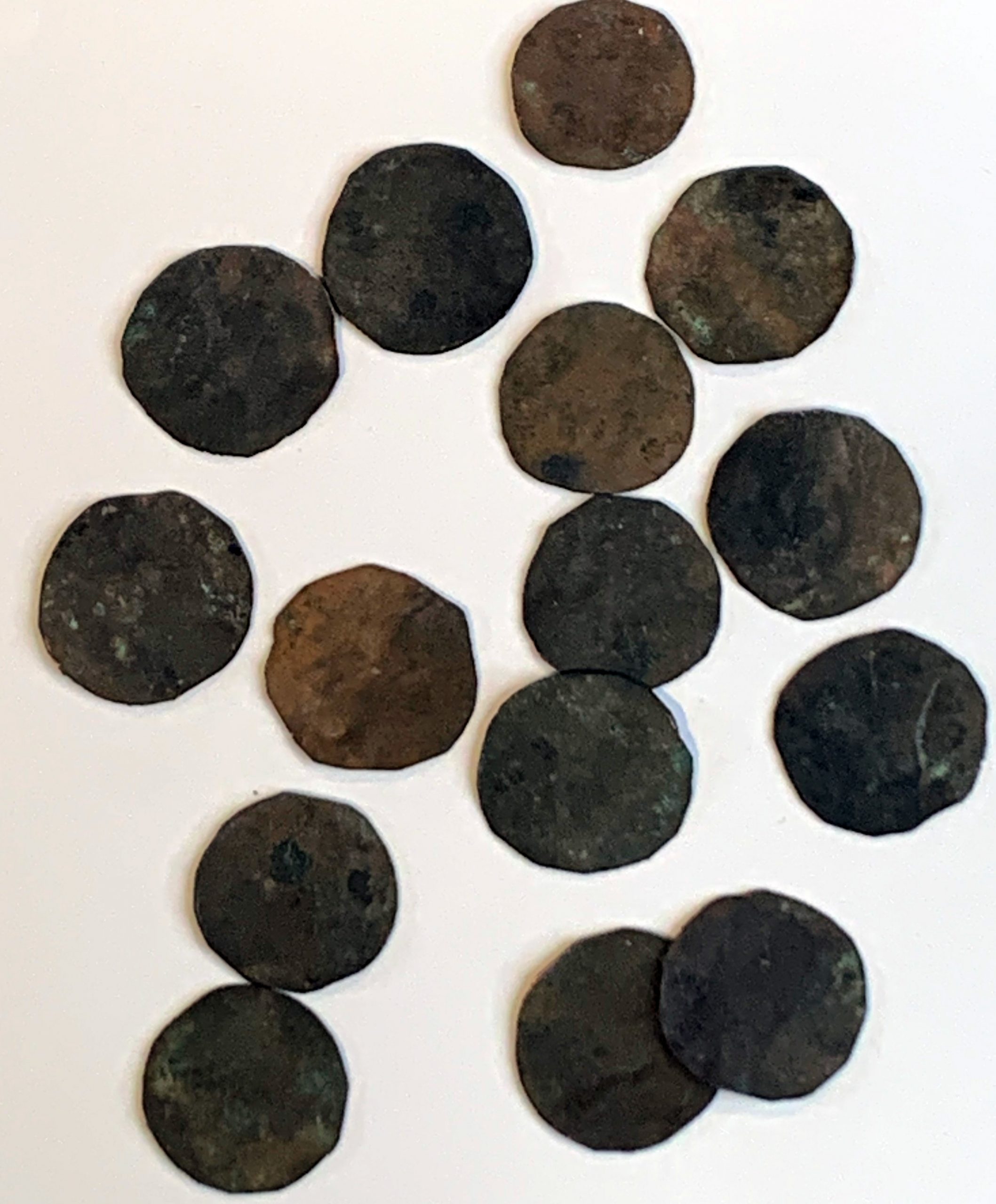 La imagen superior responde a un conjunto de quince cospeles que pertenecen a una colección particular formada hace muchos años. Los quince ejemplares tienen el diámetro de dineros y cornados de vellón como los conocidos entre los siglos XIII y XIV, aunque también igual que las blancas acuñadas por Enrique IV en 1471 y los Reyes Católicos a partir de 1497. Los pesos oscilan entre 0,79 y 1,64 g y algunos ejemplares dan muestras sí de haber sido golpeados por algún objeto contundente para aplanar la lámina.