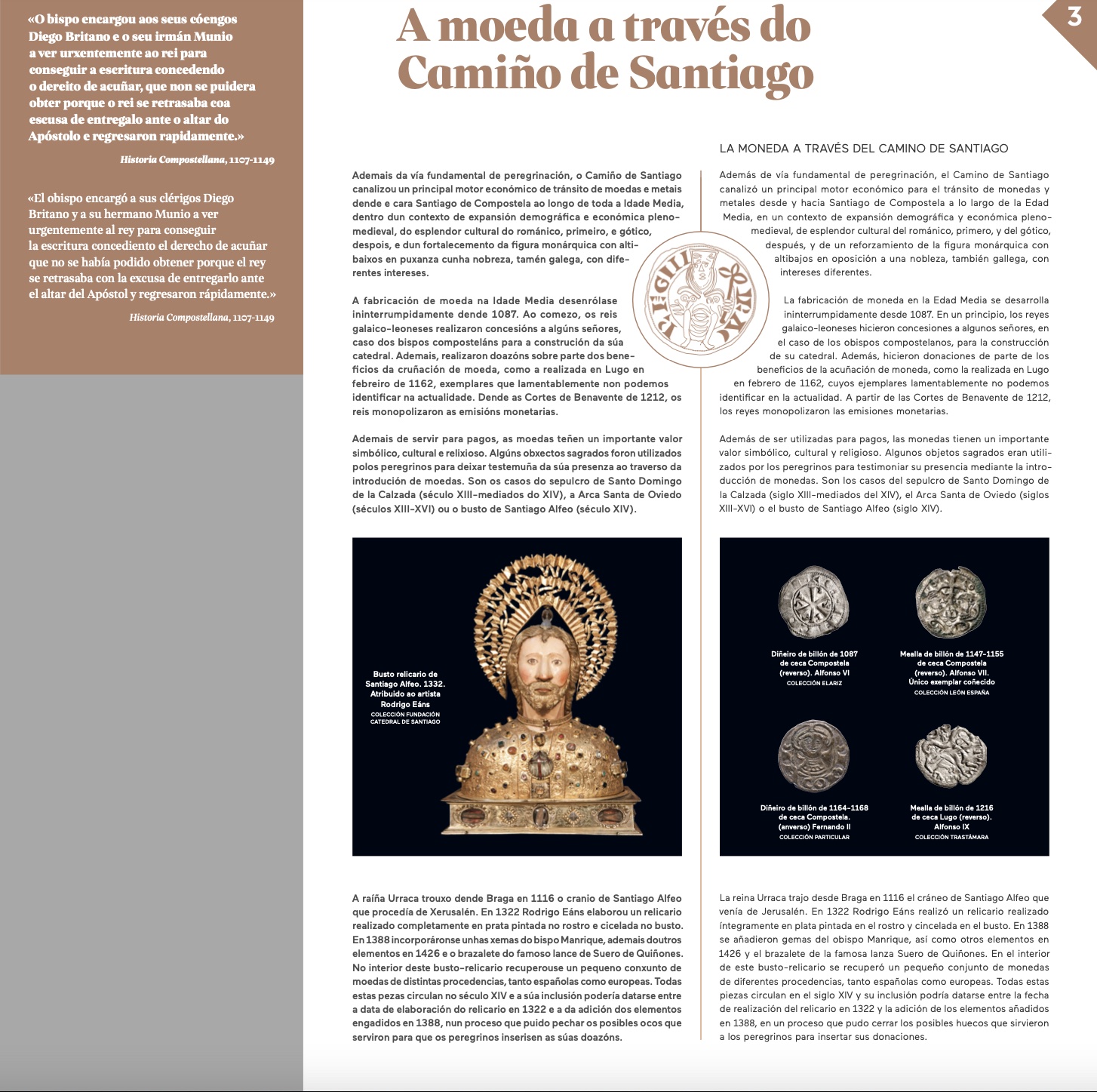 El Museo Provincial de Lugo dedica su espacio a la exposición De monetaria gallega entre marzo y junio de 2023. Una gran parte de su contenido se dedica a la moneda medieval, desde las emisiones germánicas (ocho monedas), al Camino de Santiago y a la ceca coruñesa, además de un panel sobre la creación científica en la que se destaca la figura de Antonio Orol Pernas. Entre los elementos destacados se incluye el tesoro del busto relicario de Santiago Alfeo, en la catedral compostelana. Algunos peregrinos insertaron las monedas de sus orígenes en señal de aproximación a la reliquia. Además, los asistentes podrán utilizar un espacio para fotografiarse con imágenes de monedas de la reina Urraca de gran tamaño.
