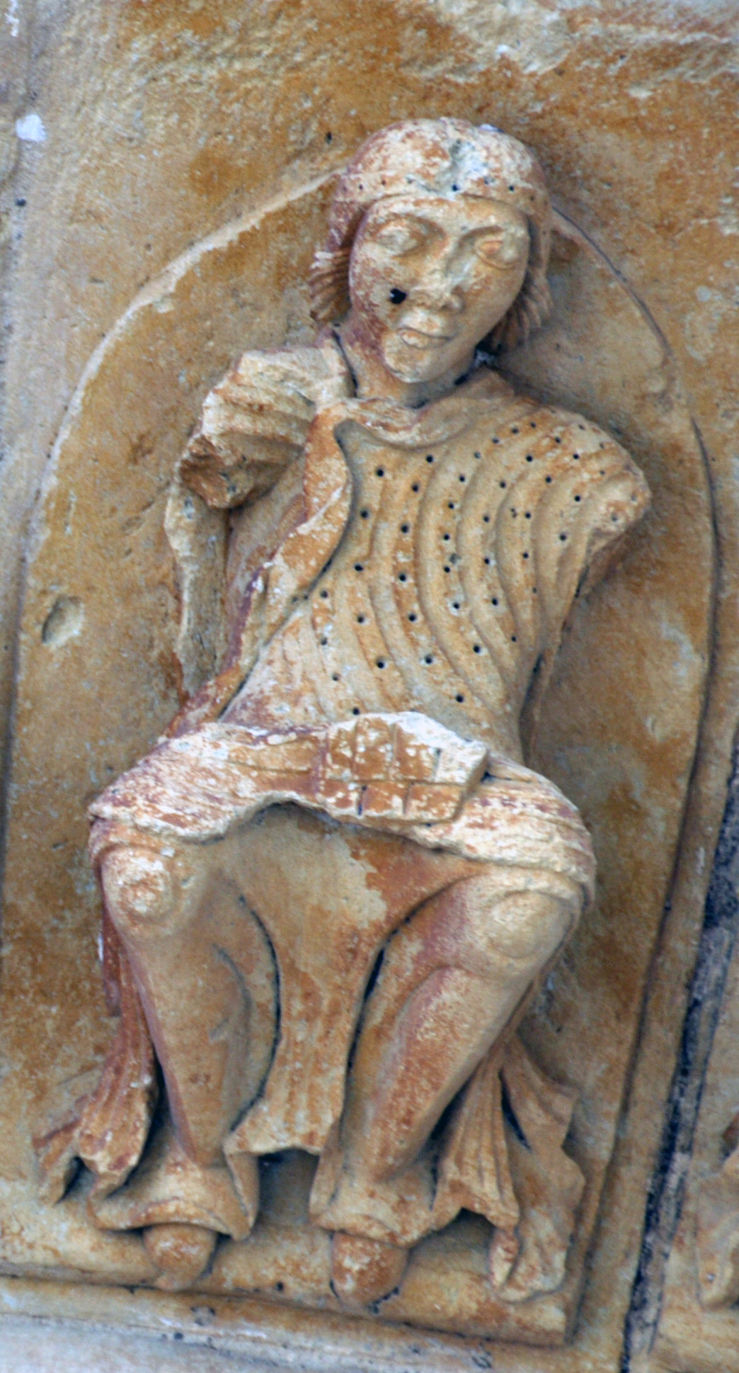 Si la escena más importante de monederos es la representada en el pórtico de la iglesia De Santiago de Carrión de los Condes, la del pórtico de Arenillas de San Pelayo se le encuentra próxima. En realidad, esta iglesia, distante de Carrión a algo más de 35 km, en un espacio aislado y lejano al Camino de Santiago, se encontraba vinculada con aquella desde 1168. Las figuras aquí representadas son semejantes, no siguen el orden establecido en Carrión y tienen una terminación menos brillante. Lo mismo que con Carrión, nos vamos a fijar en las figuras presentes en el arco.