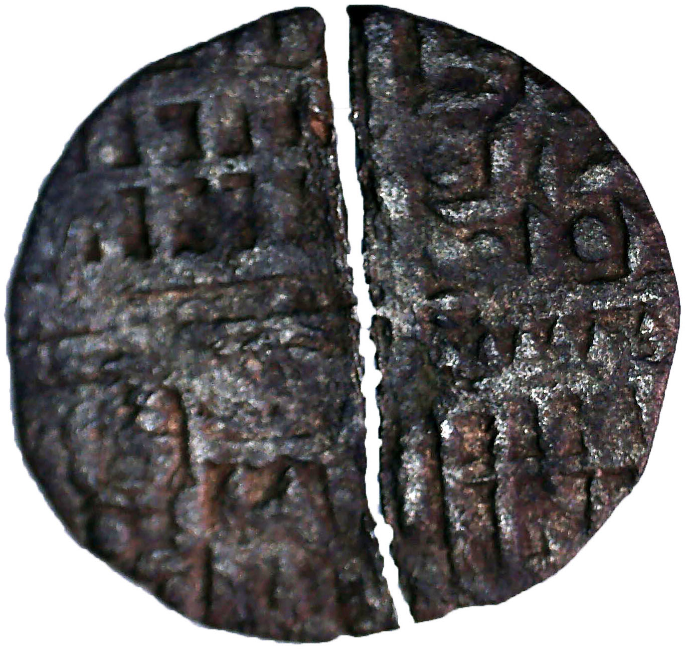 Algunas monedas se parten por la mitad o en porciones inferiores aparentemente para servir como fracción. Es el caso del siguiente dinero de Alfonso VIII de los años finales del s. XII correspondiente a una emisión rica en plata en un período de escasez de numerario (MOMECA 29.1A2.2, imagen MOMECA).